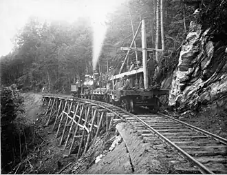 The route was surveyed in the summer of 1895.[8]: 6  As local labor was used as much as possible, the actual work of grading the roadbed was delayed until the haying season was over. Much of the roadbed was cut from the sides of the hills, and grading was done with hand tools, wheelbarrows, and horse-drawn carts.[1]: 52? [8]: 7  Five miles of roadbed were graded in 1895, and the remainder was graded in the summer of 1896.[8]: 6  Grading work came to a halt when the ground froze, and the first rails were laid thereafter.[1]: 52  Wooden trestles were built to span gorges along the right of way. In a process that continued until 1904, the trestles were subsequently replaced with "grout" or waste stone, which was used to fill the ravines.[1]: 52  The fill was "fine" grout from the cutting sheds, as large blocks falling could have destroyed the trestle structures.[12] The largest—and last filled—of the gorges took 6,600 carloads of grout.[6]: 23 [1]
