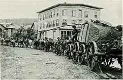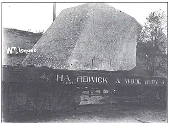 Largely as a result of the World’s Columbian Exposition in 1893, granite became a very popular building material for commercial and government buildings.[10][7]: 224  While the finer-grained granite of Barre was preferred for monuments and gravestones, the coarser-grained Woodbury stone found a market in "architectural" uses such as buildings and paving.[3] As demand grew, the granite-finishing operations in Hardwick began to look farther afield for sources of the raw stone. While some quarries had been opened in nearby Woodbury,[11] transportation of the stone to the finishing sheds was problematic: it was slow and difficult, and caused significant damage to the roads. The limitations of horse-drawn wagons would prevent much further growth in the local industry.[1] Ordinarily, a horse was needed for every ton of granite hauled by wagon.[8]: 4  It once took an 18-horse team three days to move a large column of rough granite from the quarry to Hardwick (a distance of 6 miles (9.7 km) or more, depending on the route), after which 20 road culverts needed to be rebuilt.[1][6] Such a team might be followed by a one-horse wagon loaded with axes, shovels, peavies, and other tools to repair the damage.[12] Transportation was somewhat easier in the winter, as the frozen ground would not give way, and snow allowed the use of sleds, which encountered less friction.[8]: 5