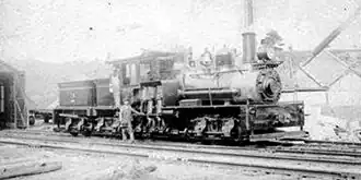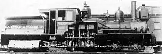 The railroad’s first locomotive was the 4-4-0 Hinkley rod locomotive it leased from the Boston & Maine.[8]: 6  When this engine outlived its usefulness (largely because it could not ascend the steeper grades beyond Burnam Hill[8]: 7 ), the company bought a Shay locomotive (whose gear drive enabled it to handle steeper track) from the Barre & Chelsea.[8]: 7, etc.  This was given the number 1 and named E.H. Blossom for the railroad’s general manager.[1]: 53  It had two trucks and eight 32.5-inch (83 cm) drive wheels, and weighed 40 tons.[8]: 11  This locomotive was used for the rest of the construction of the line, and then was the railroad's only service locomotive for several years.[1]