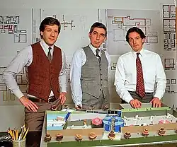 ![]() Left to right: Malcolm Holzman, with Los Angeles County Museum of Art drawingsHugh Hardy, Norman Pfeiffer, NYC office, 1981 | |