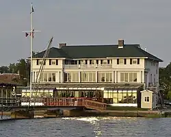 For the next ten years, the club occupied both locations – a clubhouse in Manhattan and its City Island station on Hunter Avenue. In 1898, the club began building a Victorian-era clubhouse on City Island, which opened in June of the following year. Its opening was heralded by a "salute of seventeen guns ... an illumination [of the fleet], and fireworks ashore and afloat."[6] By 1901, The New York Times noted that, "...in place of the fishing smacks and oyster boats that once anchored in East Chester Bay is the fleet of the Harlem Yacht Club."[7] In 1903, the club gave up its location in Manhattan, which was taken over by the newly formed Metropolitan Yacht Club.[8]