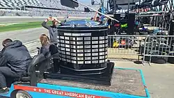 The Harley J. Earl Perpetual Trophy, the "official" version of the award, is housed at the Daytona International Speedway. It stands about four feet (1.2 m) tall, five feet (1.5 m) wide and is in the same triangular "tri-oval" shape of Daytona International Speedway. It's removed from its display once a year to appear in victory lane with the winner of the Daytona 500.[7] In 2010, the trophy was removed from the Daytona International Speedway, transported to the Indianapolis Motor Speedway and put on display alongside the Borg-Warner Trophy – awarded to the winner of the Indianapolis 500 – in the Indianapolis Motor Speedway Hall of Fame Museum during the Indianapolis 500 race week.[8]