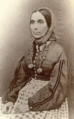 The regiment was mainly made up of men from Concord and Exeter, led by Col. Gilman Marston.[1] Dame marched and camped alongside the troops, often as the only woman among a thousand men.[3][6] She was appointed matron of the 18th Army Corps hospital in September 1864. Her duties included supervising other nurses, and cooking for the hospital patients, often numbering in the thousands.[7] Marston said of her: "Miss Dame was the bravest woman I ever knew. I have seen her face a cannon battery without flinching while a man took refuge behind her for safety from flying shells. She was always present when most needed."[5] She saw action at first Bull Run, second Bull Run, Fredericksburg, and Gettysburg.[5] Dame's tending to the men went beyond medical attention; she would sometimes pick strawberries for the wounded, or write letters home for them.[8] Dame's nursing duties varied as well; sometimes she would oversee supplies, other times she would investigate the sanitary conditions of other regiments.[7] Dame remained at this hospital until the end of active war operations, when she reconvened with the 2nd New Hampshire Regiment. On December 25, 1865, the regiment was mustered out of service, ending Dame's service.[9]