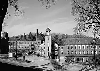 Cheshire Mill No. 1, with its distinctive bell tower, was constructed in 1848 by Cyrus Harris from New Hampshire granite. It was one of the last remaining operational textile mills in New England, closing its doors in 1970.[6] The site also includes the abutting Cheshire Mill No. 2, a red brick structure built in 1859, as well as Cheshire Mill No. 3, 4 and 5, built in the early 20th century.[7]