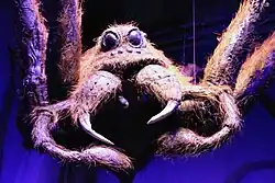 The visual effects team worked alongside creature effects supervisor Nick Dudman, who devised Fawkes the Phoenix, the Mandrakes, Aragog the Acromantula, and the first 25 feet (8 m) of the Basilisk.[61][65] According to Dudman, Aragog was the most challenging character to create. The giant spider stood 9 feet (3 m) tall with an 18 feet (5 m) foot leg span, each of which had to be controlled by a different team member. The whole creature weighed three quarters of a ton.[61] It took over 15 people to operate the animatronic Aragog on set.[66]