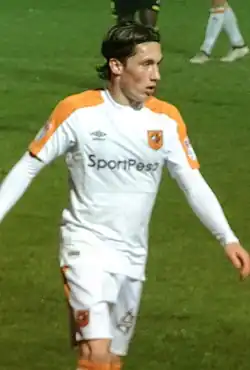 He scored his first professional goal in his second appearance a week later in a 0–2 away win at Nottingham Forest.[24] The following month, he scored two goals and recorded two assists to help Hull away from the relegation zone and won the club's Player of the Month award for March.[25] He also won the EFL Championship PFA Player of the Month award for April 2018.[26] He scored seven goals in 13 league appearances for Hull during his loan spell.[27]