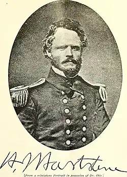 There's a photo of him autographed 'H.J. Hartstene'[18] and a Civil War photo of him labeled "Capt. Hartstein". He, his wife, and daughter were each listed as Hartstein on the passenger list of the steamer Fulton, the ship that took them to Le Havre, France in 1867, the year before he died. However, his obituary in 1868, his daughter's in 1880, and his wife's in 1903, all used Hartstene. Since map makers knew the island was named after him, they followed suit. The United States General Land Office's official map changed from Hartstein to Hartstene between 1883 and 1887. Many maps from the 1860s and throughout the 20th century used Hartstene. The Hartstine spelling appeared on a few maps in the 1890s, followed by Harstine in the early 1900s.[19] The post office on the north side of the island that operated from 1892-1926 was probably always called 'Harstine Island', but who first used that spelling is unknown.
