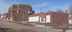 The back of the Hartington City Hall and Auditorium with the new Hartington Fire Hall behind it (east) along Centre Street.