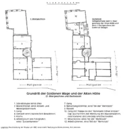 Above the ground floor there were two cantilevering half-timber framed floors, their gable side facing the market with two gable floors above. However, in comparison to the first floor the second floor protruded only on the side facing the market. The eastern side, facing the cathedral, displayed a very delicate design of the timber framing, which formed a pattern of saltires. The timber framing could be compared to the design at Schwarzer Stern, which had been built at Römerberg shortly before. In contrast to the Goldene Waage the Schwarzer Stern was rebuilt in the 1980s after its destruction in World War II. The timber frame of the upper floors also showed almost continuous rows of narrow windows on all sides. On the first floor there were eleven windows to the eastern side, six to the northern. On the second floor there were twelve windows to the eastern and four to the northern side. The glazing was completed around 1750.[5]