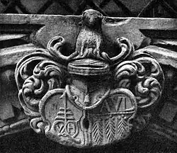 Judging by its outward appearance, the Goldene Waage appeared to be a typical renaissance building in Frankfurt's historic city center: a tall foundation made of red sandstone that outwardly showed intricate, richly decorated arcades – four of which pointed towards Hell's Lane (Höllgasse), two towards the market. The arcades were based on widely overhanging imposts; the keystones depicted lions' heads. The front door, which was decorated by a double lintel, was located between the two arcades facing the market. While the upper one was connected to the (extended) column shafts of the arcades, the lower formed almost a straight line. Its keystone displayed the coat-of-arms of Abraham van Hamel and his wife Anna van Lith (as can be seen in the photograph). The arms of alliance coat-of-arms consisted of two men's shields directly next to each other. The right-hand shield displayed a vertical arrow with a barbed hook and three horizontal lines over the shaft. The arrow ended between two ovals, which formed the letter A(braham) with their curves and one linking line. The letters V(on) and H(amel) could be seen in the ovals themselves. The left shield displayed three stoat's tails in the lower two-thirds and the letters A(nna) V(an) L(ith) in the upper area. The helmet crest was a guardian ram (German: Hammel), undoubtedly a reference to the name of the builder.