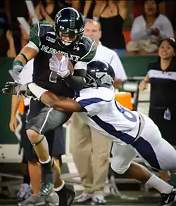 The Hawaii Rainbow Warriors football statistical leaders are individual statistical leaders of the Hawaii Rainbow Warriors football program in various categories,[ 1] including passing , rushing , receiving , total offense , defensive stats, and kicking . Within those areas, the lists identify single-game, Single season and career leaders. The Rainbow Warriors represent the University of Hawaii at Manoa in the NCAA 's Mountain West Conference (MW).
