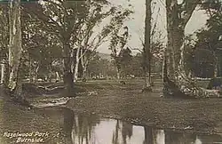 The biggest attraction in the suburb is the park and accompanying Burnside Swimming Centre. This location is only open through summertime because it is an outdoor pool and is very popular on hot days in Adelaide (greater than 300C) when it is open late.[8] First creek continues its journey from the hills through the park, the water flowing from Waterfall Gully and into Tusmore. The creek cuts through the middle of the park and is dammed at one point to create a pond. This is a popular place for children to feed the ducks and families to sit by. There is one playground in the north-east of the park and there are several sets of tables and a few barbecues dotted throughout the park. The park is relatively large by local standards and there are no playing fields. It is more strongly characterised by massive old Gum trees that can be seen from blocks away. Although it has good facilities, it is normally not as popular as the nearby smaller Tusmore Park. It is also the location of a very popular traditional carols night, held annually on the first Sunday in December.[9]