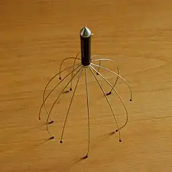 One such massage device is the "Orgasmatron", made of partially flexible copper wires attached to a handle and operated manually. It is made by an Australian company of the same name. The device is sold in the United States under the name "Happy's Head Trip". The Orgasmatron was designed by Dwayne Lacey, who registered the design in 1998.[1] Since it was first brought to market, several similar devices appeared, resulting in legal action from Lacey.[1] According to The Guardian, the device induces "a heavenly, tingling sensation".[2]