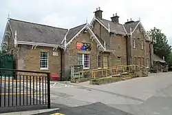 The old station building and platform it stands on is no longer in railway use (the building is privately owned) - a replacement platform has been built a few yards further down the line towards Horsforth, giving the station a staggered platform configuration.[3]