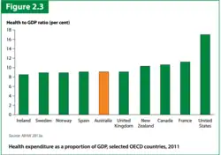 Australia's health-expenditure–to–GDP ratio (9.9%) in 2022–23 was slightly above average compared with other OECD countries.[16]