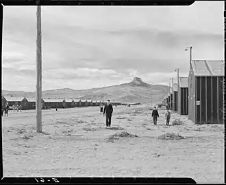 Heart Mountain towers at the end of "F" Street, the main thoroughfare of the Heart Mountain War Relocation Center (August 28, 1942)