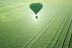 Heiligenschein, or hotspot, around the shadow of a hot-air balloon cast on a field of standing crops (Oxfordshire, England)