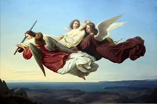 Biblical topics were the first for which Mücke was well known. In the core of his early painting career he completed such works as: Saint Catherine carried by Angels to Mount Sinai (1836); Saint Ambrose and Emperor Theodosius (1838); Saint Elizabeth taking Farewell of her Husband (1841); Saint Elizabeth Giving Alms (1841), the last of which pieces is hung in the National Gallery Berlin, Alte Nationalgalerie. Further liturgical oils of the late 1840s,early 1850s and undated works are: Coronation of the Virgin (1847); Saint Adelbert (1851); Cycle of Life of Saint Meinrad; Good Shepherd; and Christ Crucified.