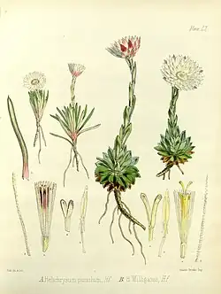 Original illustration of Helichrysum pumilum (left) alongside H.milliganii (right) by Joseph Dalton Hooker.[2]