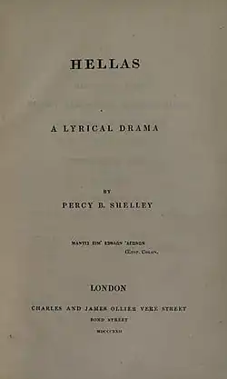 Hellas is a lyrical drama by Percy Bysshe Shelley, written in 1821 and published in 1822 by Charles and James Ollier in London. Shelley wrote it while living in Pisa, with a view to raising money for the Greek War of Independence. It was to be Shelley's last published poem during his lifetime.[1]