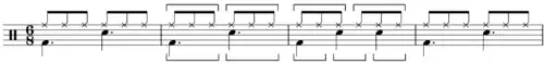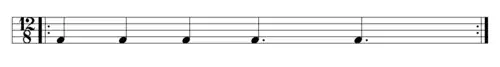 This figure is a common African bell pattern, used by the Hausa people of Nigeria, in Haitian Vodou drumming, Cuban palo, and many other drumming systems. The horizontal hemiola suggests metric modulation (6
