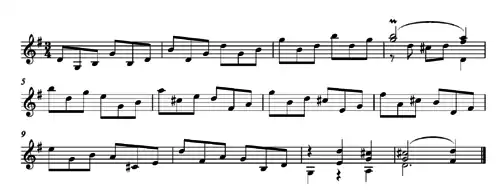 The minuet from J. S. Bach's keyboard Partita No. 5 in G major articulates groups of 2 times 3 quavers that are really in 6
