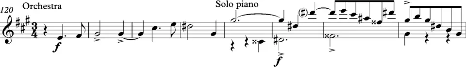 2 (a so-called hemiola). Metrical ambiguity arises in the very first appearance of the motto [opening theme]."[16]