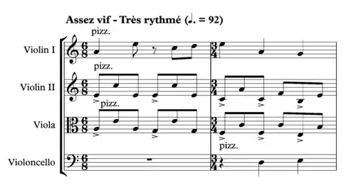 At the beginning of the second movement, Assez vif – très rythmé, of his String Quartet (1903), Ravel "uses the pizzicato as a vehicle for rhythmic interplay between 6