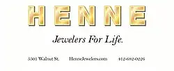 Henne Jewelers is a family owned jewelry store located in the Shadyside (Pittsburgh) neighborhood of Pittsburgh. The store was founded in 1887 by Rudolf Joseph Henne.[2][3][4][5][6][7][8]