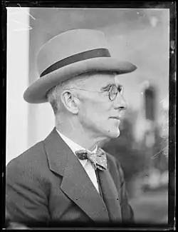 Gullett's eventual entry into politics came at the 1922 election, where he and his friend John Latham stood as anti-Hughes "Liberal" candidates. His initial attempt to win the Division of Henty was unsuccessful, but he reprised his candidacy at the 1925 election as an "independent Nationalist" and was elected. He allied himself with backbenchers holding similar views and in 1927 attracted attention by referring to Country Party leader Earle Page as "the most tragic Treasurer Australia had ever had".[12] However, as with Latham, Hughes' successor as prime minister S. M. Bruce secured Gullett's support by inviting him into the ministry. He was appointed Minister for Trade and Customs in November 1928, following the 1928 election, but held office for less than a year before the government's defeat.[14]