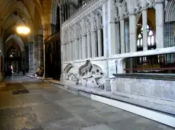 Cross-legged effigies of two knights, believed to represent Sir Henry de Raleigh (d.1301), left, and Sir Humphrey de Bohun, order uncertain. South choir aisle/ambulatory, Exeter Cathedral, looking westwards