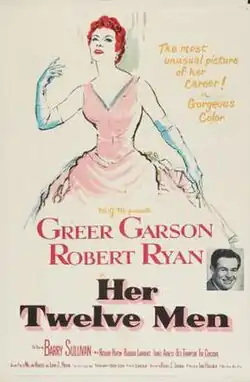 Her Twelve Men is a 1954 American comedy drama film starring Oscar-winning Greer Garson and Robert Ryan, directed by Robert Z. Leonard, and written by William Roberts and Laura Z. Hobson. This MGM production was based on the best-selling pseudo-autobiographical book written by Louise Maxwell Baker, Snips and Snails. Baker herself taught at an all-boys boarding school, as the only female teacher in the school. Subsequently, Louise recounts many of the funny stories from her time as a teacher in Snips and Snails, which then translates into the film, Her Twelve Men.
