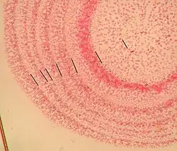 Like trees and woody plants, perennial herbs have a growth zone called vascular cambium between the root bark and the root xylem. The vascular cambium ring is active during growing season and produces a new layer of xylem tissue or growth ring every year. This addition of a new lateral layer each year is called secondary growth and is exactly the same as in woody plants. Each individual growth ring consists of earlywood tissue that is formed at the beginning of the growing season and latewood tissue formed in summer and fall. Earlywood tissue is characterized by wide vessels or denser arrangement of vessels, whereas latewood tissue shows narrower vessels and/or lower vessel density.[1][2]
