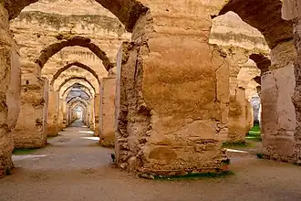 The Heri es-Swani or Heri es-Souani (Arabic: هري السواني, lit. 'silo of the norias'), sometimes also transliterated as Hury as-Swani[1][2] or Hri Swani,[3] is a historic monument in Meknes, Morocco. It was a massive structure that served as a granary or silo for the Imperial Kasbah built by Moulay Isma'il during his reign from 1672 to 1727. It was part of a larger compound of facilities which also included the attached House of the Ten Norias, which provided water for the palaces, and a large water basin nearby known as the Sahrij Swani or Agdal Basin.[4][3] The name "Heri es-Swani" often applies to both the House of the Ten Norias and the silos, which are connected to each other and visited as a single attraction by tourists today.[5] In popular usage the silos are often misidentified as the "Royal Stables", but those stables were in fact a different structure that existed further south.[6][7]