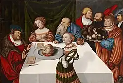 Together with Salome, Herodias was a frequent subject in depictions of the Power of Women topos in the later Medieval and Renaissance periods. The most common moment shown including Herodias is the Feast of Herod, showing Salome presenting John's severed head on a platter as Herodias dines with her husband and others.
