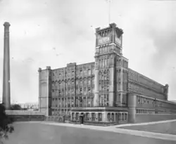 In the second half of the 19th century Oldham became a world centre for spinning cotton yarn.[6] This was due in a large part to the formation of limited liability companies known as Oldham Limiteds. In 1851, over 30% of Oldham's population were employed in the textile sector, compared to 5% across Great Britain.[7] At its zenith it was the most productive cotton spinning mill town in the world.[8][9] By 1871 Oldham had more spindles than any country in the world except the United States, and in 1909, was spinning more cotton than France and Germany combined.[10] By 1911 there were 16.4 million spindles in Oldham, compared with a total of 58 million in the United Kingdom and 143.5 million in the world; in 1928, with the construction of the UK's largest textile factory Oldham reached its manufacturing zenith.[6] At its peak, there were over 360 mills, operating night and day.[11][12]