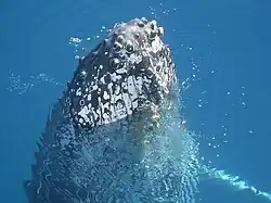 Hervey Bay is a resting place during the annual migration of approximately 35,000 humpback whales along Australia's east coast from the Great Barrier Reef down to the Antarctic Ocean. This migration involves approximately one third of the world's humpback whales. Most female whales each spend about two weeks in Hervey Bay nursing their calves. Young whales also rest in the bay but very few adult male whales rest in the bay.[9] Whales can normally be seen in the bay between July and November each year, where they exhibit many playful behaviours.[10][11] There are many companies offering whale watching tours in the bay during that time.[4] There are strict rules applying to the operation of boats in the vicinity of whales to avoid harm or stress to the whales.[12] Due to the popularity of the albino whale Migaloo (first sighted in 1991), there are particularly strict rules relating to approaching Migaloo or any seemingly white whale that might be Migaloo.[13]