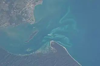 Hervey Bay is a bay of the Coral Sea in the Bundaberg Region and Fraser Coast Region of Queensland, Australia.[1] The bay covers 4,000 square kilometres (1,500 sq mi) with a main opening facing northwards. The northern end of the bay is about 80 km wide and its average depth is about 20 metres.[2] In the south of the bay lies the Great Sandy Strait. The Mary River, Burrum River and Burnett River flow into the bay.[2] Hervey Bay is partly protected from oceanic swells by the southern extension of the Great Barrier Reef.[3] To the east of the bay is K'Gari (formerly known as Fraser Island).