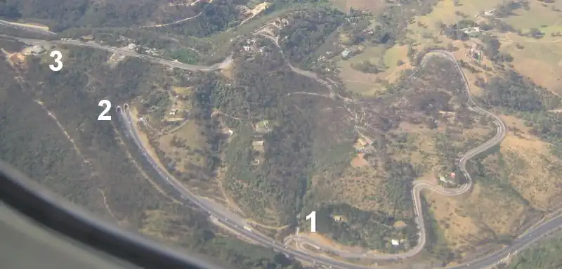 Adelaide-Crafers Highway: Eagle on the Hill (3) is directly above the Heysen Tunnels entrance (2), with the old road winding round from Devil's Elbow (1).