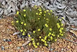Hibbertia hibbertioides is a prostrate or sprawling shrub that typically grows to a height of up to 30 cm (12 in) and usually has glabrous branches, at least when they are mature. The leaves are crowded, pale-coloured, linear and cylindrical to triangular in cross-section, 3.5–17 mm (0.14–0.67 in) long and 0.5–0.6 mm (0.020–0.024 in) wide. The flowers are arranged singly in leaf axils or on the ends of short side shoots, and are sessile or on a peduncle up to 17 mm (0.67 in) long with inconspicuous bracts 1–2 mm (0.039–0.079 in) long. The flowers are 10–15 mm (0.39–0.59 in) in diameter with five sepals joined at the base, the inner sepals 5.5–7.5 mm (0.22–0.30 in) long, the outer ones distinctly shorter. The five petals are yellow, egg-shaped with the narrower end towards the base and 5–9 mm (0.20–0.35 in) long with a small notch at the tip. There are usually eleven stamens, nine fused at the base in groups of three and one or two free, arranged around the three glabrous carpels that each contain one ovule.[2][3]