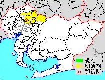 * yellow - areas formerly within the district borders during the early Meiji period