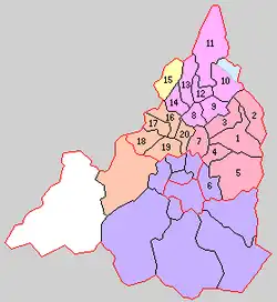 Purple=to Yonezawa City; Peach=to Nanyo City; Yellow=to Nagai City; Blue=to Kaminoyama City; Orange=Kawanishi Town;Red=Takahata Town Town