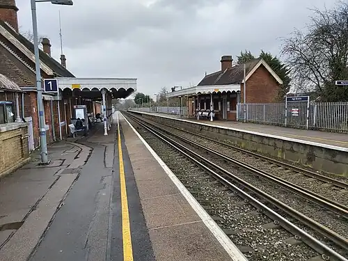 High Brooms was originally opened in 1893 as Southborough by the South Eastern Railway; it acquired its present name in 1925. It is situated on a five-mile gradient from Tonbridge to the north of the station.[1] The main station buildings are on the northbound platform. There is a closed waiting room on the southbound platform. Access to the southbound platform is via stairs from a side entrance, and access to the northbound platform is at street level. A subway links the two platforms.