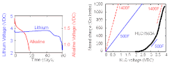Fig. 1. Left. Lithium cell voltage profile, compared with an alkaline cell. Both profiles assume depletion using the same constant power. Fig. 2. Right. Comparison of stored charge vs. voltage for HLCs and large capacitors. Over narrow voltage ranges, the HLC's stored charge increases as voltage increases, with slopes that look like 500 F -1400 F capacitors.