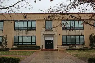 As the student body size increased, the district added another school in 1926, Bradfield Elementary, located between Southern Avenue and Mockingbird Lane.[6][5] The funds for the school came from a 1925 bond election for $250,000 to build the Bradfield Elementary and University Park Elementary Schools. To conserve money, both schools had identical blueprints: two-story brick structures with 12 rooms each.[6] Named after former HPISD board president John S. Bradfield, Bradfield Elementary School is located in Block 150 of Highland Park West,[11] and uses a Spanish Colonial Revival style. Foshee & Creek designed the school building with a cost of $68,200. The building permit was filed in 1930.[12] Following the approval of the 2015 bond package, Bradfield Elementary School will be torn down and rebuilt beginning in the summer of 2018.[10]