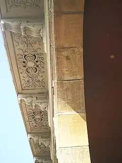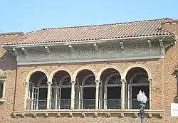 View looking up at Figueroa Street eaves from Banquet Hall balcony