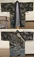Hikeshi banten is a reversible hanten coat worn by hikeshi, Japanese firefighters of the Edo period, often decorated with symbolic images. Firefighter brigades consisted either of samurai (buke hikeshi) or commoners (machi hikeshi). The coats were made of multiple layers of tightly stitched cotton fabric, quilted using the sashiko technique of running stitches. On one side, the coats had only the firefighting brigade name. The other side featured elaborate designs "resist-dyed using the tsutsugaki method". The inner designs often depicted warrior heroes, or mythical creatures associated with bravery or water, often inspired by ukiyo-e prints.[1][2][3]