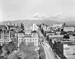 Hill Street was originally laid out in 1849 by Edward Ord. At that time, the street ended in the north at 1st Street, where the foot of Fort Hill sat. The stretch of modern Hill Street north of the old hill was originally named Calle del Toro (Bull Street),[1][2][3] was renamed Castelar in 1874,[4] and finally renamed North Hill in 1960.[5]