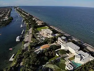 The 3.2-mile (5.1 km) strip along Florida State Road A1A is officially known as "Hillsboro Mile" in the town's boundaries, and it's the only main road in town. Because this is the only main public road, it is aligned with the residents' mansions and commonly called "Millionaires' Mile" by both local residents and visitors alike.[1] Its own official motto also notes this by referring to it as "Florida's Magnificent Mile".[2]