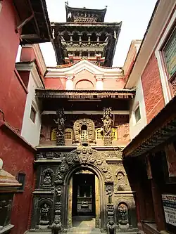 At the end there is another richly adorned gate, which gives access to the courtyard. Apart from the abundance of Buddhism related sculptures, some Hindu sculptures can be seen here. Incarnations of Vishnu en Shiva, for instance, appear as roof struts that support the roof above the gate. Having passed this second arch, one enters a small vestibule with sculptures of Mahakala and Ganesha on the wall.[4] Images of Mahakala and Ganesha, protectors of the other gods of the Kathmandu Valley, guarding the entrance of a vihara is a regular occurrence in Nepal.[9]